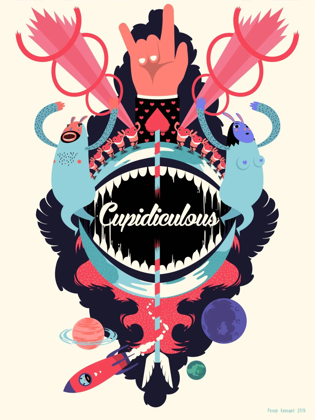 Cupidiculous (2014) is a motion graphic project fusing 2D cel-animation and 3D techniques together. It conveys a humor story about Cupid, who makes Adam and Eve fall in love. But this act of love leads to overpopulation, overconsumption and global warming. So he has to find the way to fix these problems. Most characters and elements have been done in 3D but rendered as 2D flat vector look with poppy pastel, splashy and heightened color schemes. Then added more 2D liquid speed lines by drawing frame by frame. Even though laughter is the major objective, but Cupidiculous also delivers critical messages covertly. More or less audiences will get that with absolutely enjoyment.